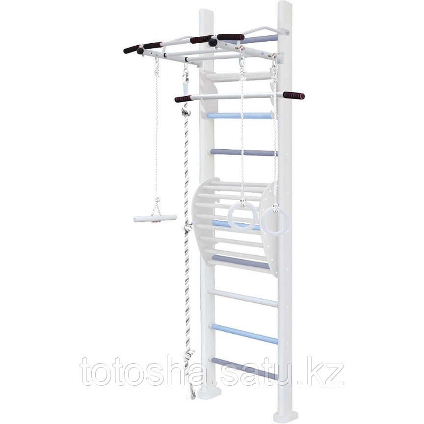 В комплекте : шведская стенка, турник, канат, кольца, тарзанка, тренажер для осанки, 4 пристенных кронштейна;